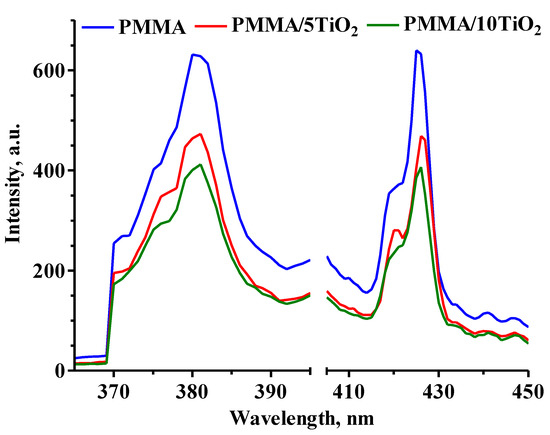 In order to study the effect of the TiO2 content on the optical properties of PMMA, the excitation and emission spectra of electrospun materials were recorded and compared (Figure 6). The excitation spectrum of PMMA fibers had a maximum at 380 nm, which corresponds to the absorption maximum of the polymer, while its fluorescence maximum was at 425 nm. Interestingly, the fluorescence intensity was quenched upon the addition of TiO2, and this quenching depended on the amount of TiO2 added. The same positions of the maxima in the spectra indicate that TiO2 did not change the structure of the PMMA matrix. On the other hand, the decrease in the fluorescence intensity can be explained by the interaction of TiO2 with the lone pairs of oxygen atoms in the structure of PMMA, which led to a change in its polarization.