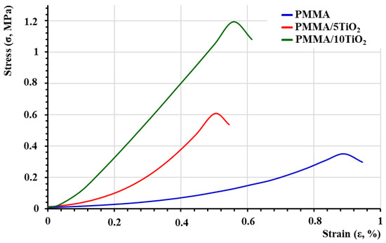 Stress–strain (σ/ɛ) curves performed at tension of specimens at a constant rate are shown in Figure 7. All curves showed a smooth linear increase in the stress with increasing strain. The curve for PMMA fibers displayed a high deformation at relatively low stress. As can be seen, the composite fibers had better mechanical properties compared to the PMMA fibers. Moreover, the addition of TiO2 resulted in a proportional increase in the stress with increasing strain, which ended with the sample breaking.