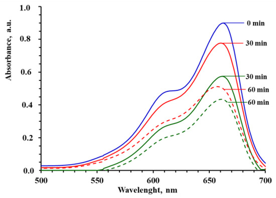 Absorption spectra of MB (blue line) after UV light irradiation (30 and 60 min) in the presence of electrospun PMMA/5TiO2 (red lines) and PMMA/10TiO2 (green lines) composites.