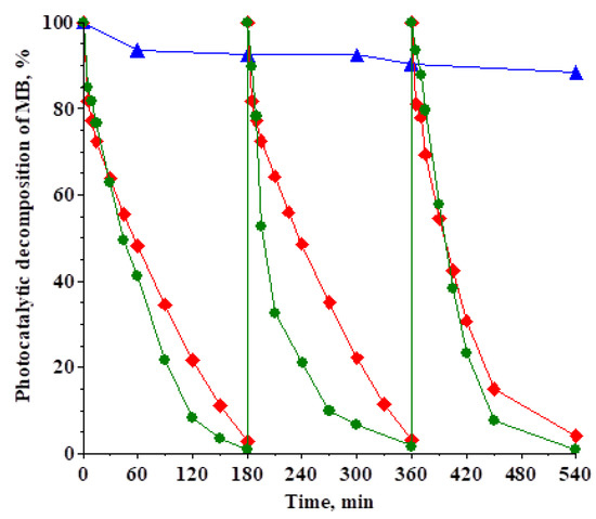 Three consecutive cycles of MB degradation at 660 nm under UV light irradiation in the presence of electrospun PMMA (blue line), PMMA/5TiO2 (red line), and PMMA/10TiO2 (green line) composites.