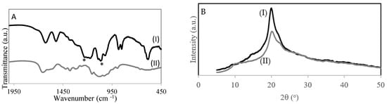 (A) FT-IR spectra of catalysts: (I) 4-CH-SO3H; (II) chitosan. (B) XRD of (I) chitosan and (II) 4–CH–SO3H catalyst.