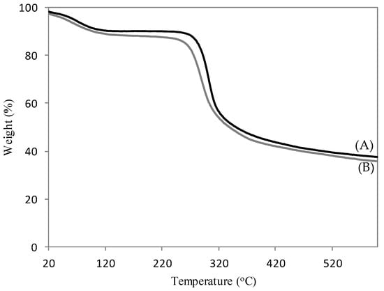 TG curves of the chitosan (A) and the 4–CH–SO3H catalyst (B).