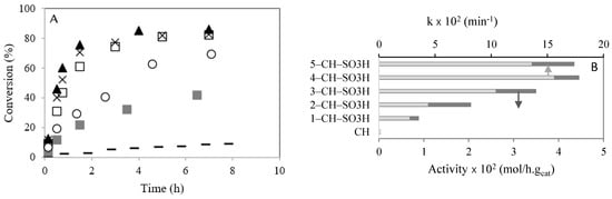 Figure 5A shows the conversion (%) of caprylic acid versus time (h). After 90 min of reaction, the caprylic acid conversion was 22, 30, 61, 75 and 72% for the 1–CH–SO3H, 2–CH–SO3H, 3–CH–SO3H, 4–CH–SO3H, and 5–CH–SO3H materials, respectively.