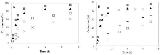 ) m = 0.3 g;. (B) effect of molar ratio of alcohol to caprylic acid. Conversion (%) versus time (h): (☐) 1:15 (m = 0.2 g); (×) 1:63 (m = 0.2 g); (▲) 1:95 (m = 0.2 g); (−) 1:15 (m = 0.3 g); (