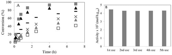 Figure 7A shows the conversion of caprylic acid with methanol and ethanol at 60 °C. The loading of 4–CH–SO3H catalyst (m = 0.2 g) and the temperature (T = 60 °C) were kept constant. A decrease in the caprylic acid conversion is observed when ethanol is used compared with the experiment using methanol. This result can be explained by ethyl nucleophile being less reactive than methyl nucleophile [26,27]. Likewise, steric hindrance increases with molecular size [21,23]. When the reaction is performed using ethanol at 80 °C, an increase in the reaction rate is observed. The conversion of caprylic acid is increased when the amount of catalyst increases from m = 0.2 g to m = 0.3 g.