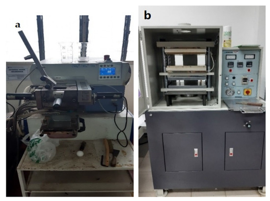 (a) Brabender Plastograph internal and (b) hot press machine.
