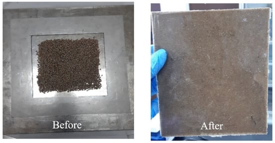 The kenaf and AgNPs were prepared through a Brabender Plastograph internal mixer as shown in Figure 1 to mix homogeneously at 150 °C for 50 min, and the speed was fixed at 60 rpm. HDPE with a mass of 24 g was added into the chamber, and then kenaf with a mass of 16 g [28] and AgNPs was varied to 0.82 g (2 wt%), 1.67 g (4 wt%), 2.55 g (6 wt%), 3.48 g (8 wt%), and 4.44 g (10 wt%). The composites were produced in the form of a sheet (1 mm) using a hot-press machine (Figure 1) at 150 °C and cooled for 5 min. All composites were dried in an oven for 24 h at a temperature of 70 °C. Figure 2 shows the samples before and after the compression process. All tests were carried out at Universiti Putra Malaysia (UPM), Malaysia.