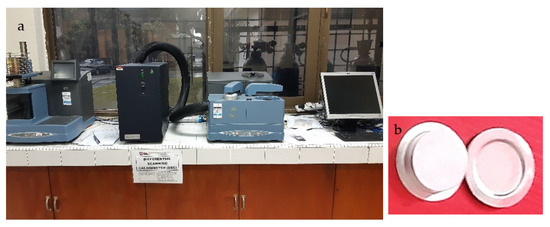 (a) Differential Scanning Calorimeter (DSC) and (b) aluminum sample pan (5 mm).