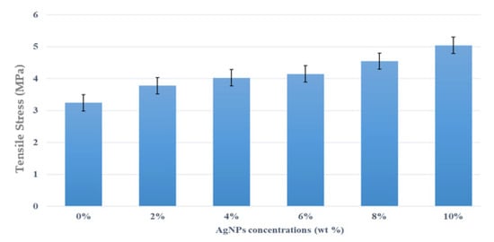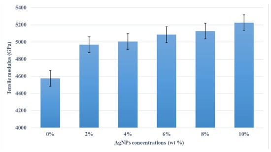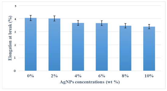 Figure 7 shows the elongation at the break of the kenaf/HDPE composites with different concentrations of AgNPs. From the observations, the elongation of kenaf/HDPE composites shows decreased with increasing the AgNP content compared to composites without AgNPs. This is due to the higher ductile behavior of kenaf/HDPE composites with increased AgNP content compared to those without AgNPs. The results for the elongation at break for various percentages of AgNP addition in kenaf/HDPE composites are illustrated in Figure 7. Such results show the decrease in elongation as a larger percentage of AgNPs is added to the composites. The kenaf/HDPE composites with a maximum addition of 10% AgNPs were able to display the lowest elongation, among other samples. The elongation at break follows a reverse trend with that of tensile strength and modulus. As the concentration of AgNPs increases, the amount of elongation at break decreased. This phenomenon may be due to excessive polymer and fiber interactions, hard domain rotation, interface slippages and fibrillation on the matrix [35,36]. In addition, it might occur because AgNP content is a large percentage of crystallinity, slowly losing its ductile properties, with additional rigid silver nanoparticles. The impact of AgNP addition to kenaf/HDPE composites has, therefore, been shown to be more essential for tensile stress and tensile modulus, whereas the elongation is dropped significantly due to the addition of AgNPs that restrict the molecule chain to move, which makes the chain lose its ductility and high in stiffness.