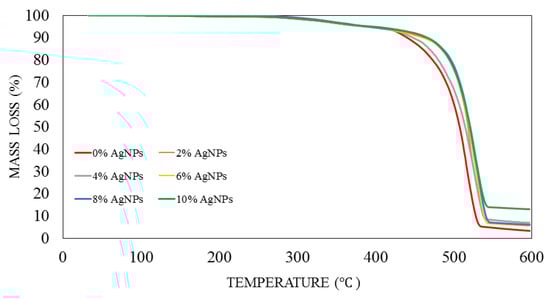 TGA measured the thermal stability of the pure kenaf/HDPE composites with different concentrations of silver nanopowder. The degradation temperatures of kenaf/HDPE composites with different contents of AgNPs (0 %,2 %,4 %,6 %,8 % and 10 %) are exhibited in the TGA graph shown in Figure 8. The curves indicate that thermal degradation only occurred after some concentrations of heat energy had been incorporated into the components. Additionally, it is clear that all the kenaf/HDPE composites with different AgNP contents showed that there was no significant difference in the value of thermal stability from each other. The onset degradation temperature was observed.