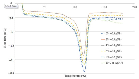 DSC study on materials is important because it can analyze the properties of composite materials [43]. From Figure 9, the glass transition temperatures, Tm (midpoint values), of kenaf/HDPE composites with AgNPs are greater than those of kenaf/HDPE composites without AgNPs. The results indicate that the addition of AgNPs tends to increase the prohibition of the movement of the polymer matrix chain. The Tm (onset value) of the kenaf/HDPE composites also significantly increased with increasing the AgNPs contents from 2 wt% to 10 wt%, and it indicates that the addition of AgNPs into Kenaf/HDPE composites is more stable than without AgNP content. Kenaf/HDPE composites with more AgNPs have a Tm (onset value) slightly higher than those with less concentration of AgNPs, and therefore the thermal properties of kenaf/HDPE composites have also been impacted by AgNPs. The Tm (onset value) for kenaf/HDPE with 10 wt% is 128.53 °C when compared to those with a lower concentration of AgNPs. The Tm (onset value) increases due to AgNP content, which can make the structure between kenaf and HDPE change and increase the structure by the content of AgNPs. Combining AgNPs into composites enhanced the thermal stability and was similarly reported by another author [44,45,46]. Variations in the Tm (midpoint value) might also adversely determine the compatibility of the samples. From Table 2, Tm (midpoint value) levels of kenaf/HDPE composites with 0 wt% of AgNPs is lesser (129.97 °C) than kenaf/HDPE composites with 10 wt% of AgNPs (133.83 °C). The intermolecular forces between kenaf/HDPE composites matrixes are due to AgNPs in mixes, which can strengthen the interfacial bond between mixing components [37,45]. The combination of kenaf/HDPE composites with AgNPs provided the advantages to produce quality multifunctional materials and it is also suitable for various manufacturing applications.