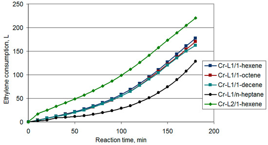 In all experiments on Cr-PNP catalyzed oligomerization of ethylene described in the literature, the choice of the reaction media was limited by saturated hydrocarbons and aromatic solvents [38,41,49,50,51]. Given that α-olefins are formed during ethylene oligomerization, we proposed that α-olefins can be initially used as a reaction media, and made comparative experiments on ethylene oligomerization, catalyzed by Cr-L1, in n-heptane, 1-hexene, 1-octene, and 1-decene. In addition, we studied an opportunity to reduce the content of MMAO-12 and TMA (that may hamper further polymerization) and found appropriate [Al]/[Cr] ratio of 200 for oligomerization stage. The results of our experiments under optimized conditions are presented visually in Figure 1.