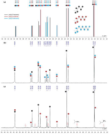 (a) Schematic reference 13C {1H} NMR spectra of isotactic poly(1-hexene), poly(1-octene), and poly(1-decene) (13C {1H} NMR spectra of these homopolymers are presented in Figure S4 in the Supplementary Materials); 13C {1H} NMR spectra (CDCl3, 50 °C, 101 MHz) of the copolymers P2c (b) and P2 (c). New signals in spectrum of P2 are pointed by red arrows.