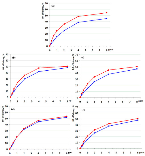 Dependence of the DR effect on the concentration for solutions of polymers PH (a), P1 (b), P1c (c), P2 (d), and P2c (e), in n-heptane at 7 °C (blue lines) and at 22 °C (red lines). Capillary turbulent flow rheometry data, the average of the three measurements for each point.