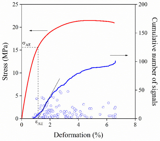 Results of the acoustic emission testing of a hPP1 composite containing 15 vol% CaCO3 with an average particle size of 3.6 μm. Solid lines are the cumulative number of signals trace (right axis) and the corresponding stress vs. deformation trace (left axis).