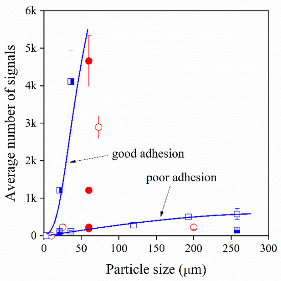 The effect of interfacial adhesion on acoustic activity is also demonstrated in Figure 2. Increased adhesion, i.e., the presence of MAPP, leads to the drastic increase in the number of signals detected, it increased from 60 to 1200 for the smaller and from 500 to more than 10,000 for the largest particles. On the other hand, the treatment of CaCO3 with stearic acid resulting in the decrease in the strength of interfacial adhesion between the filler and the matrix results in a smaller number of events. Obviously, the strength of interfacial interactions has an even stronger effect on the number of signals emitted during the measurement than particle size.