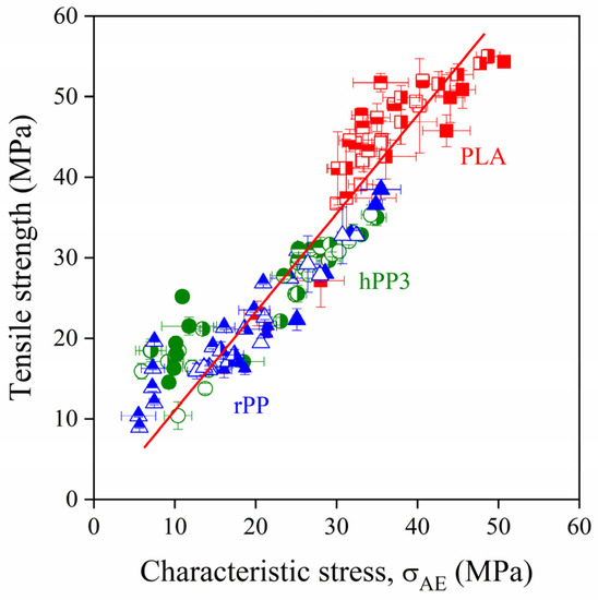 As mentioned previously, local deformation processes determine the macroscopic properties of heterogeneous polymer systems. This statement is further supported by the results presented in Figure 9, in which the tensile strength of several lignocellulosic fiber reinforced PP and PLA composites is plotted against the characteristic initiation stress derived from acoustic emission results. An unambiguous correlation exists between the two quantities, confirming that the dominating local process determines the strength of the composites irrespective of its mechanism. The correlation is valid independently of the type of the reinforcement as well as the matrix polymer used in the study and it also indicates that composite properties can be improved by the proper control of the micromechanical deformation processes occurring during deformation.