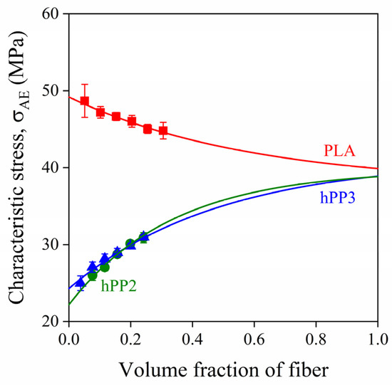 At good adhesion, fiber fracture is frequently the dominating deformation mechanism in lignocellulosic fiber reinforced composites. As shown by Figure 9, the initiation of the process leads to failure, thus the upper limit of reinforcement is determined by the inherent strength of these fibers. If we plot characteristic stresses determined by acoustic emission testing at good adhesion against fiber content and extrapolate them to the volume fraction of 1, the inherent strength of lignocellulosic fibers can be obtained, as shown in an earlier study [32]. The method of determination is demonstrated in Figure 10 for sugarpalm fiber-reinforced PP and PLA composites. As shown by the figure, the fitted exponential correlations converge on the same final value which is obviously the inherent strength of the fibers. We obtain very similar values for the two PP grades and PLA validating the procedure further. We have to point out that the approach can be used only if adhesion is strong between the components, and fiber fracture dominates failure [32].