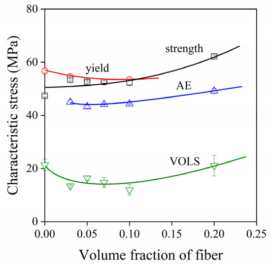 Characteristic stresses derived from various measurements plotted against fiber content for PA6/W68 composites.