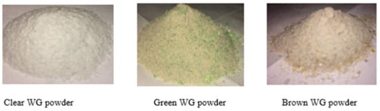Glass is inorganic, non-metallic, hydrophobic, incombustible, and brittle, although it is highly ductile at high temperatures []. It can be classified into 24 types, but the major types are soda-lime, fused silica, lead, vitreous silica, borosilicate, alkali silicate, aluminosilicate, germanium oxide, and barium glasses [,,]. It can also be flat or shaped into bottles, cathode ray tubes, or lamp glasses, depending on its production and use []. Typical WG powder is shown in Figure 1. The WG, when processed into fine particles, fulfills the requirements for the physical, mechanical, and chemical characteristics of Class F and Class C pozzolanic materials according to the guidelines provided by ASTM C 618 standards []. Therefore, it can be incorporated into concrete as SCM. Additionally, the glass particles’ sizes are decided based on the roles of WG in concrete. In general, as SCM, particle sizes should be below 600 µm. For fine and coarse aggregate replacement, WG particles’ sizes are selected below 4.75 mm and 14 mm, respectively. The density and surface area of WG particles can be changed by treatments such as washing, milling into the required size, and gradation. For the detailed milling and grinding process, the readers are redirected to [,,].