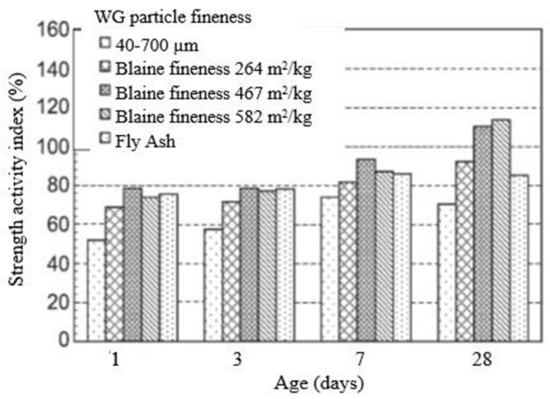 The main reason for using SCM in concrete is its pozzolanic reactivity, which is very important because, through this reaction, a high amount of final hydration calcium-silicate hydrate (C–S–H) products are formed in concrete. Pozzolanic reactivity is directly related to the amount of reacted CaO, Ca(OH)2, in the sample and the production of C–S–H products []. Being amorphous and containing a high amount of SiO2 (Table 1) and some CaO, WG shows high pozzolanic reactivity []. In concrete, pozzolanic reactivity depends on the particle size and amount of WG and the curing conditions. Pozzolanic reactivity of WG powders is around 70–110% [,,] at 28 days, which meets the criteria for pozzolanic materials by ASTM C 618 []. Typical pozzolanic behavior of WG is presented in Figure 3 []. This figure shows how the pozzolanic index of WG varies with its fineness and age for a cement replacement level of 20%. As shown in Figure 3, the pozzolanic reactivity of the glass powder increased with its specific surface area. With increased fineness and amorphous content, the pozzolanicity of glass powder can be even higher than the pozzolanicity of commonly used fly ash. The finer WG powder has a high silica release rate; it has a higher chance of reaction with Ca2+ and OH− ions in an alkaline medium and forms a higher amount of C–S–H. The recommended particle size of the WG powder is 75 µm for high pozzolanic reactivity, and the finer powder is more pozzolanic [,]. Moreover, these size group WG particles show no unfavorable ASR expansion in concrete []. The maximum WG particle size is ≤600 µm to avoid the ASR expansion either by WG SCM or aggregates in concrete []. Details of the ASR parameters for WGC are discussed in Section 4.1.