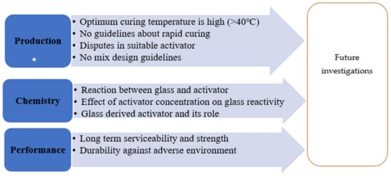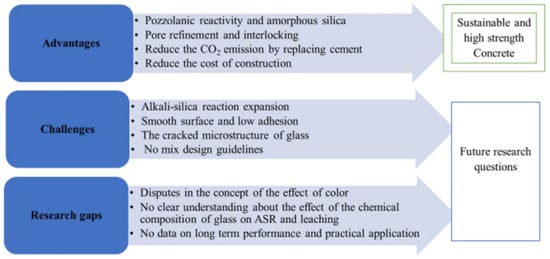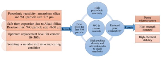By washing in an alkaline solution or applying heat treatment, the pozzolanic reactivity of WG can be increased because both methods reduce impurities and increase the rate of silica dissolution []. However, it is not clear which chemical and physical variations have a key influence on the pozzolanic reactivity of WG and the optimum treatment conditions. However, to ensure the optimum rate of silica dissolution throughout the entire strength development period, well-graded WG particles are essential. Glass particles could have microcracks and entrapped voids within them due to unusual processing, which is one of the reasons for ASR expansion []. Currently, no research has investigated customized WG processing and particle size distribution to optimize their reactivity in concrete. Further investigation of the impact of the size distribution and grinding of glass is required to understand the optimum processing and gradation of WG for high-performance concrete.