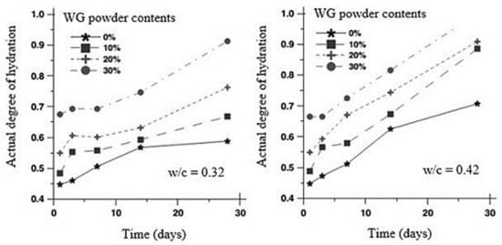 Degree of hydration in cement pastes with various amounts of WG powder [].