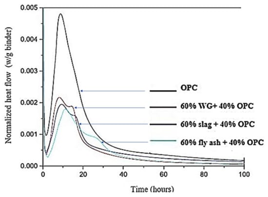 Hydration of the binder is an important stage for the development of the microstructure and strength of concretes. The degree of hydration of cement paste generally increases with WG powder content (Figure 5) []. The time of the first heat flow peak observation in OPC + 60% WG powder is shorter than that in OPC + 60% slag or OPC + 60% fly ash, as shown in Figure 6 []. This is due to the higher silica dissolution in WG powder paste compared to slag and fly ash, which creates a higher chance of reaction with Ca(OH)2. However, compared with pure cement, the induction time was very close. There was also a slight increase in the induction period with an increasing amount of WG in the binder []. The alkaline medium and the amorphous SiO2 content in the WG powder induce pozzolanic reactivity []. Thus, a high number of reaction products are developed that cause substantial heat release during hydration in concrete, and the heat flow is generally much higher than that of other traditional SCM, such as fly ash and slag (Figure 6). This occurs in the early stage of hydration due to the less reactivity of silica in fly ash and slag compared to in glass []. The production of a high amount of portlandite (C–H) and C–S–H is an indication of enhanced hydration and improved strength development in cementitious pastes with WG powder [,].