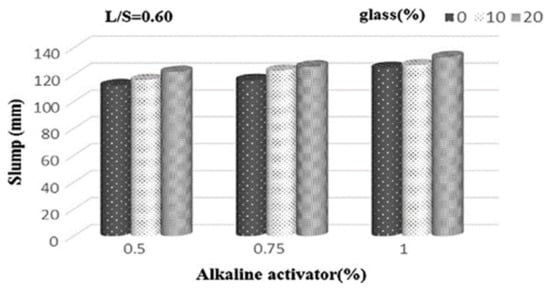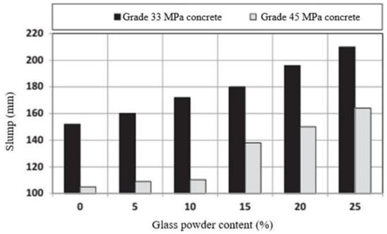Slump value is a measure of the workability of concrete and is controlled by the roughness, fineness, and amount of WG, regardless of the mix proportion, mixing technique, and water/cement ratio in concrete. Based on the literature, a WG particle of size 45–150 μm has a positive effect on the slump value of WGC. Because of the smooth surface and low water absorption of fine WG powder (≤150), concrete shows a higher slump value with increasing WG powder content (Figure 7) []. With an increasing amount of WG, the workability of concrete increases regardless of the grade of concrete. For cement replacement by WG (<75 µm) of 0–30%, the slump of the concrete mix can be increased by 130–190 mm []. Due to the lower specific surface area of WG powder compared to OPC, less water flow is achieved, which improves the slump value. Moreover, in fine WG particles, the angularity of the WG does not lead to friction against the flowability of the concrete, and these are suitable for producing self-compacting concrete.