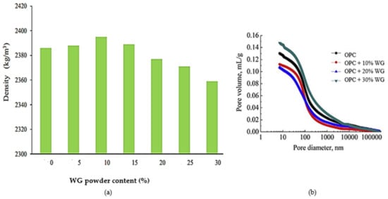 Pozzolanic reactivity and filler effects are the two most important roles of the WG particle packing density and porosity reduction of cement concrete. The density of concrete varies according to the fineness, amount, and type of WG. Figure 8a shows a significant increase in concrete density with up to 10% cement replacement by WG powder. He et al. [] found improvement in the density of concrete using 20% WG powder (0.8–110 µm) (Figure 8b). At a low replacement level (<20%), WG powder performed a filler role that reduces the voids between particles within concrete. A significant amount of hydration products (Ca(OH)2 and C–S–H) are formed, and the microstructure of concrete is densified with the high pozzolanicity of WG powder when added at the optimum level of replacement (20–30%) []. The density of concrete also increases due to the higher unit weight of fine WG powder (<75 µm) compared to that of cement [].