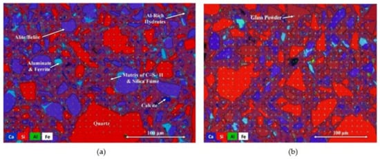 Chemical mapping of the surface in an ultra-high performance concrete (specimen showing the different anhydrous and hydrous phases) (a) without WG; (b) with 30% WG (12 µm particles) replacing cement [].