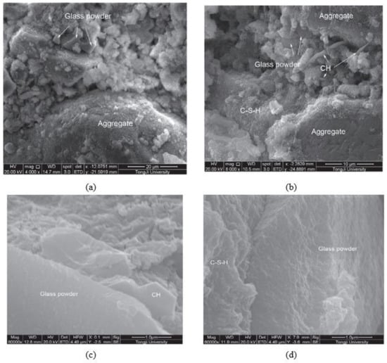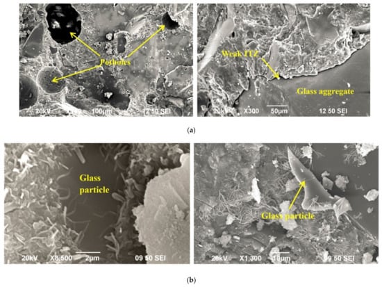Scanning electron microscopy (SEM) images of a specimen are generally used to show the internal pores, connectivity of pores, and uniformity of final reaction products in concrete. The microstructure of WGC depends on the particle size, mix ratio, and pozzolanic reactivity of WG. Finer and highly amorphous silica containing WG is suitable for producing a denser concrete micro-structure. Glass particles (<1.18 mm) act as microfilters at the early age of curing, and at low temperatures, their reactivity is low. WG particles of size below <75 µm show high filler and pozzolanic activity within the concrete and help to increase the density of concrete with a dense microstructure of the hardened matrix [,]. As found in ultra-high-performance concrete (Figure 9a,b), when 30% cement is replaced by WG (12 µm particles), the WG particle creates a denser skeleton, where the spacing between anhydrous inclusions and the thickness of the zone of hydrates are reduced []. The reactive surface of WG enhances the bond with the surrounding mortar and thus gives improved macro-scale strength compared to a matrix with similarly sized inert particles [].