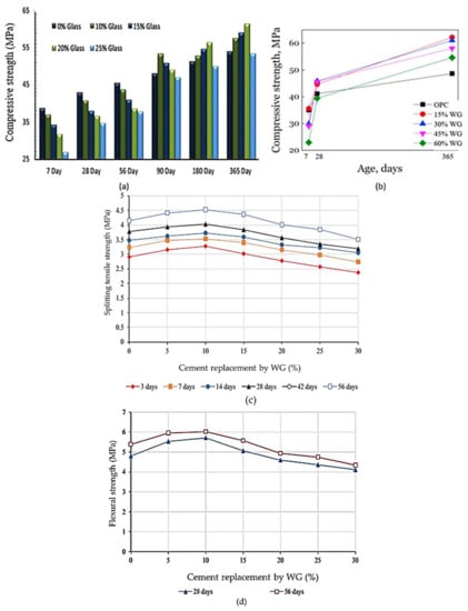 The variation in the strength of concrete with WG as SCM. (a) Compressive strength of concrete with WG powder (Particles < 75 µm) in replacement of cement []. (b) Compressive strength of WGC with WG powder (particles < 120 µm) as SCM []. (c) Splitting tensile strength of concrete with varying content of WG (Particles < 100 µm for cement replacement) and curing periods []. (d) Flexural strength of concrete with WG (Particles < 100 µm for cement replacement) [].