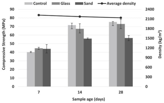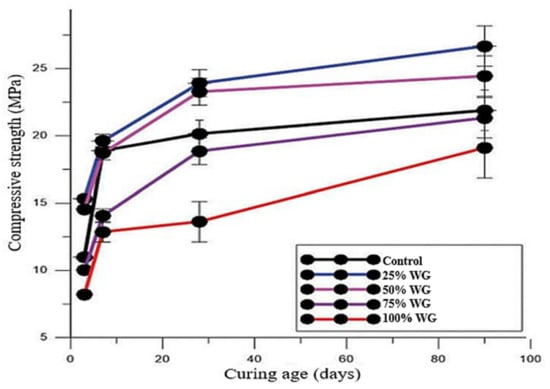 Fine WG aggregates refine and redistribute pore sizes and strengthen the ITZ of concrete; thus, within finely ground WG, the strength of WGC increases. Olofinnade et al. [] replaced 100% sand with WG of particle size 0.8–5 mm and found that, with up to a 50% replacement level, the strength of concrete was significantly improved compared to the control concrete (Figure 14). Ismail et al. [] reported that the flexural strength of concrete at a 28-day curing age was improved by 3.57%, 6.96%, and 11.20% with the addition of 10%, 15%, and 20% WG (particle size 0.6–2.36 mm), respectively. The fine WG aggregates (<600 µm) participate in the hydration of binder and produce more reaction products, which improves the concrete strength. Due to the filler and pore refinement characteristics of fine WG, a high interlocked bond is developed, resulting in uniform stress distribution. However, with increasing particle size, the pozzolanicity of WG decreases, a lower amount of SiO2 dissolution occurs, and consequently, less C–S–H production takes place. Moreover, due to ASR susceptibility, a significant number of transitional C–H products may be destroyed and turn to expansive gels, which drives a significant strength reduction [,,].