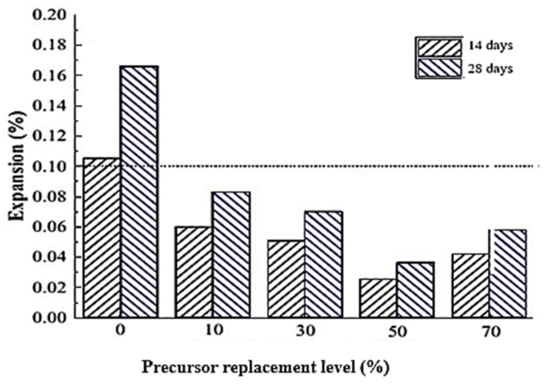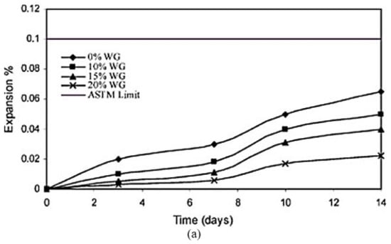 The alkali content and silica in the WG powder react and form ASR gels. These gels are expansive and worsen when absorbing water or chemicals. Therefore, ASR of WG harms the strength and durability of concrete [,,]. The ASR gel reacts with the hydration products (CH and C–S–H) and deteriorates the microstructure of concrete. Expanded ASR gels produce stress and create microcracks within the concrete core, which consequently leads to bond loss. The ASR vulnerability increases with the increasing amount of WG and its particle size; however, there are debates on the contribution of WG binder and WG aggregates to ASR expansion. Ismail et al. [] observed decreasing ASR expansion in mortar with an increasing WG amount (particle size 0.6–2.36 mm) as a replacement for 0–20% fine aggregates (Figure 15a). In this case, the expansions in WGC were well below the ASTM limit (0.1%) []. However, [] observed that when OPC was replaced by 30% WG (38 µm), the ASR expansion increased by 40% compared to the control mortar bar at only 16 days of age. Therefore, the testing condition and concrete mix proportion play an important role in ASR expansion in WGC.