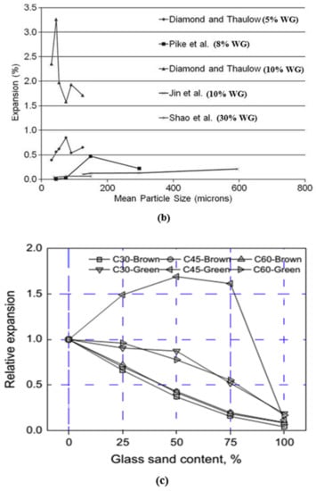 ASR expansion of WG concrete. (a) Expansion of mortar bars with WG (particle size: 0.6–2.36 mm) []; (b) variation in the ASR expansion with mean WG powder particle size []; (c) relative ASR expansion with varying glass content, color, and concrete grades [].