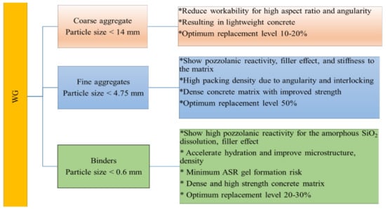 WG glass with particle sizes larger than 4.75 mm is considered coarse aggregates in concrete and is typically sized up to 16 mm []. These types of WG aggregates are being used to replace the stone/brick chips in concrete to impart large volumes and mechanical strength []. Coarse WG particles do not show any pozzolanic reactivity, but due to their angularity and edges, WG particles help interlock the aggregate and cement paste with high bond strength. However, very limited studies have considered the use of WG coarse aggregate in concrete because of its unusual properties.