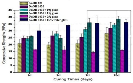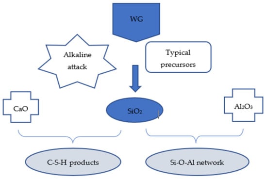 Geopolymers are a class of inorganic aluminosilicate-binding materials with an amorphous or semicrystalline three-dimensional structure []. The production of a geopolymer is associated with the reaction of aluminosilicate raw materials with alkaline activators, and therefore requires a substantial source of silica []. WG powder can be used as a precursor, fine aggregate, and activator in the production of cement-free geopolymer binders and geopolymer concretes [,,]. Current applications of WG concrete (WGC) include precast concrete elements for building construction, paving blocks, marine structures, foamed concrete, geopolymer concrete, and geopolymer foams for lightweight structures [,,]. The physical properties, chemical composition, amount, and particle size of WG used in concrete are the main parameters that control the performance of WGC [,]. Lightweight but high-performance concrete can be developed using WG as SCM, precursors, or aggregates [,,,]. For example, Adaway and Wang [] observed a 6% higher compressive strength for concrete with 30% glass aggregates compared to the control specimen. As reported in previous research [], around 30% improvement in strength and high interfacial bonding strength can be developed by using WG aggregates in geopolymer concretes. Alkaline characteristics and high silica dissolution from fine WG powder are the main parameters for strength development in geopolymer concretes.