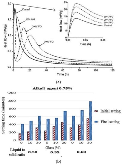 However, a retarding effect at early-stage hydration was observed in cement pastes with WG powder that had P and Zn elements []. These components in WG can combine with free SO42− and OH− ions in the solution and produce ZnSO4.nH2O, CaSO4.nH2O, and other SO42− products, which can delay hydration reactions []. The retardation rate in hydration can be reduced by using WG powder with particle sizes below the threshold limit of the pozzolanic requirement. As reported in the literature, glass particles below 75 µm show a higher hydration degree [,,]. Another matter of concern is the flash and false setting of the binder due to its poor hydration. The presence of Zn and a high alkali content (Na, K) in the WG powder can trigger the flash setting of the binder []. A proper w/c ratio (0.45–0.50) can positively influence the degree of hydration and setting. However, the dilution of constituents may also delay the reaction when the w/c ratio increases beyond the optimum level (0.45–0.50). Previous reports claim that glass possesses water-repellent characteristics, which may delay the setting of composites when they are agglomerated []. Due to the limited data and conflicting information in the current literature regarding the impact of WG on setting time, understanding and guidelines are still insufficient. Further investigation is required to clarify the influence of glass ingredients on hydration and the setting time of cementitious pastes. A thorough investigation is required to properly correlate the degree of hydration and pozzolanic reactivity of WG powder in concrete because there is currently no existing research in this field.