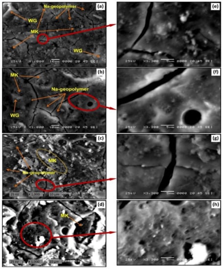 Further, by room temperature curing for up to 28 days only, a low amount of hydration products was captured, but for steam curing at 80 °C temperature, a remarkably dense matrix is produced with significant C–S–H products []. These findings and the depictions (Figure 10a–d) clearly show the high pozzolanic reactivity and filler effects of WG powder at maintained conditions. However, the microstructure of the concrete matrix could be hampered by high temperatures, and voids could be generated due to the degradation of transitional hydration products.