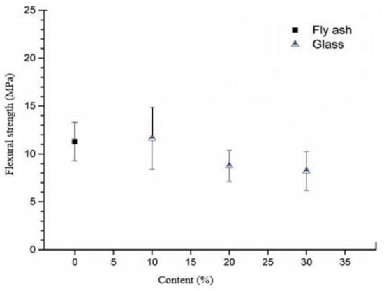 WG of particle size around 45 µm does not improve the workability compared to ordinary OPC concrete [], as the same amount of water is required by cement and WG powder of this size. For WG particle sizes less than 10 µm, a significant decrease in workability was observed for a 20% replacement of cement in concrete []. Workability decreases due to the higher water demand by WG because of the higher specific surface area of the WG particles compared to OPC.