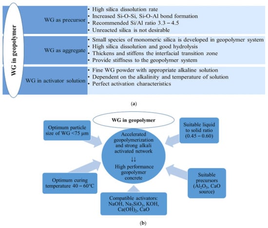 This study aims to provide a fundamental background on the use of WG in cement and geopolymer concretes and to describe its comparative performance with conventional materials. There are some review studies on WGC [,,], but most have been focused on the properties of cement-based WGC with any specific replacement type. These previous studies focused directly on the properties of WGC, where the correlations between the process parameters and role, reactivity of WG, and its constituents within concrete are still unclear. Additionally, the processing parameters are scattered in different research, which needs to be optimized for best practice. This review presents the fundamentals and science behind using WG as a binder, precursor, and aggregate in concrete. It explains the chemical composition and physical properties of WG, along with their effects on the physical, microstructural, and mechanical properties of concrete, according to existing practices and guidelines. Additionally, the guidelines about the crucial processing parameters are correlated with the reactivities of WG and the performance of concrete. The concurrent documentation of the uses of WG in cement and geopolymer concrete will be helpful for readers and practitioners. Herein, we summarize the current knowledge in this field and describe future opportunities for research to promote the use of WG in the construction sector.