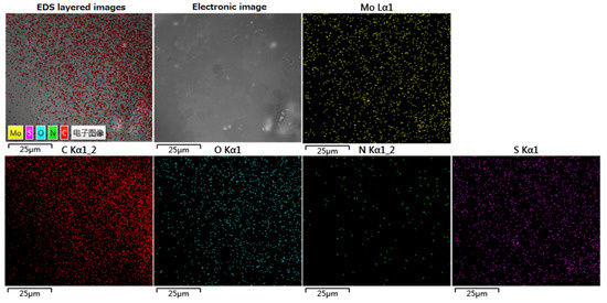Figure 2 showed the SEM-EDS element spectrum of the 2 wt% RSF/MoS2 NPs hybrid fiber after thermal decomposition. The distribution of C, N, O, S, and Mo elements can be observed, indicating that MoS2 NPs were uniformly distributed in the hybrid fiber. Table 1 showed the content of each element in the 2 wt% RSF/MoS2 NPs hybrid fibers. C, N, O, S, Mo account for 52.84%, 15.32%, 31.65%, 0.15%, and 0.04%, respectively.