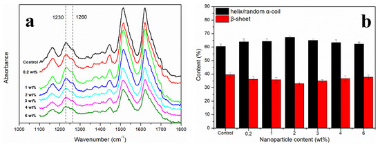 In this study, deconvolution of the amide III region (1200–1300 cm−1) was performed to detect the contents of the secondary structures of RSF [24]. Figure 3b showed the contents of α-helix/random coil (1230 cm−1) and β-sheet (1260 cm−1) in RSF and RSF/MoS2 NPs hybrid fibers. The content of β-sheet of RSF/MoS2 NPs hybrid fiber was the lowest when the content of nanoparticles was 2 wt%. This indicates that the incorporation of MoS2 NPs hindered the transition from α-helix/random coil to β-sheet, or that was not conducive to the formation of β-sheet. The interaction between silk fibroin and the surface of nanoparticles may lead to structural rearrangement of silk fibroin molecules and affect silk fibroin aggregation during the stirring and spinning process of spinning solutions with MoS2 NPs. The binding of nanoparticles to silk fibroin changed the equilibrium constant of β-sheet formation and hindered the formation of the critical nucleus and β-sheet [29]. When the content of MoS2 NPs was more than 2 wt%, they might form small-scale agglomeration in RSF, which could not make all the nanoparticles fully in contact with silk fibroin. The size of the MoS2 NPs will increase after agglomeration, which means that less self-assembly of silk fibroin was affected by the addition of MoS2 NPs.