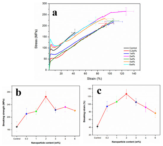 (a) Stress–strain curves; (b) breaking strength; (c) breaking strain of RSF/MoS2 NPs hybrid fibers with different MoS2 NP contents.
