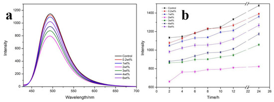 (a) The fluorescence emission spectra of RSF/MoS2 NPs with different mass fractions at 4 h. (b) The fluorescence intensity of RSF/MoS2 NPs with different mass fractions changed with time.