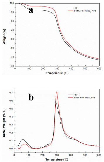 (a) TG curves of 2 wt% RSF/MoS2 NPs hybrid fibers and RSF fibers; (b) DTG curves of 2 wt% RSF/MoS2 NPs hybrid fibers and RSF fibers.