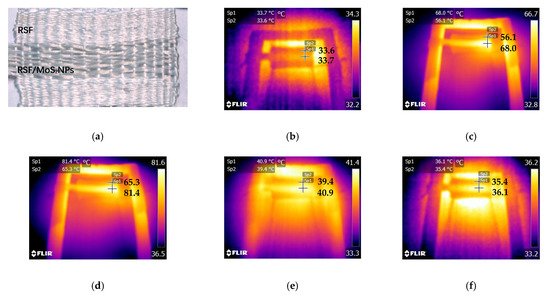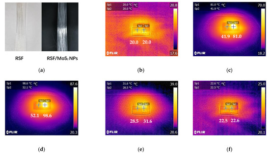 To test the photothermal effect of 2 wt% RSF/MoS2 NPs hybrid fibers in the fabric, hybrid fibers were handwoven into the fabric. Using the same test method, the surface temperature of the fabric was measured by infrared imaging. The temperature of the region made of RSF/MoS2 NPs hybrid fibers increased from 33.7 °C to 81.4 °C within 10 min (Figure 10), while the temperature of the region made from RSF fiber only reached 65.3 °C after 10 min irradiation. After cooling for 10 min, their temperatures drop to 36.1 °C and 35.4 °C, respectively (Figure 10f). The results showed that the fabric made of RSF/MoS2 NPs hybrid fibers had good photothermal conversion performance in simulated sunlight, and could be used as intelligent photothermal fibers with higher toughness.