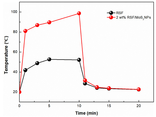 The objective of this study was to construct a practical photothermal silk fabric. Therefore, it was necessary to test the photothermal properties of RSF/MoS2 NPs hybrid fiber and its fabric. Here, the surface temperature of the fibers irradiated by a 300 W xenon lamp (λ ≥ 420 nm) for 10 min and cooled for 10 min after removal of the light source was observed by an infrared imager (Figure 8). Before illumination, there was no difference in temperature between the RSF fibers and 2 wt% RSF/MoS2 NPs hybrid fibers (Figure 8b). After simulated illumination, the temperature of 2 wt% RSF/MoS2 NPs hybrid fibers increased much faster than that of RSF fibers. The temperature of 2 wt% RSF/MoS2 NPs hybrid fibers could rise from 20.0 °C to 81.0 °C in 1 min and 98.6 °C in 10 min (Figure 8b–d), while the temperatures of the RSF fibers were only 41.9 °C and 52.1 °C at these two time points. Figure 9 showed the temperature change of RSF/MoS2 NPs hybrid fibers during heating and cooling. It is obvious from Figure 9 that the temperature of hybrid fiber rose faster than that of RSF fiber in the same irradiation time, and its final temperature was also higher. After removing the light source for 10 min, the two fibers returned to almost the same temperature.