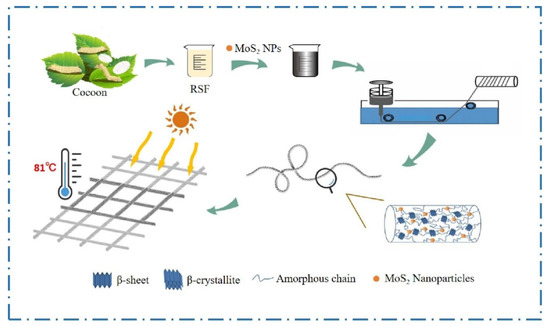 In addition, photothermal materials demonstrate remarkable optical-thermal performance which is an added advantage in textile production, medical instruments, new drug carrier, and manufacturing of military types of equipment [4,5,6,7]. However, so far, there has been little research on the functional regenerated silk with photothermal conversion properties. Improving the quality of textile fabrics has attracted researchers to incorporate photothermal materials into polymer fibers to produce enhanced photothermal fabrics [8,9,10]. Cheng et al. [11] fabricated multifunctional cotton fabrics by coating of anionic waterborne polyurethane (WPU)/Cu2-XSe. The WPU/Cu2-XSe coated cotton fabrics exhibited high photothermal conversion efficiency, and the coated fabrics also exhibited high photochromic efficiency. The excellent photothermal property and low toxicity of molybdenum disulfide (MoS2) nanoparticles (NPs) have rendered it a safer option in textile production [12,13,14,15]. For example, Kumar et al. [16] used MoS2 nanosheets to prepare modified poly-cotton masks with excellent antibacterial activity and photothermal properties. Under sunlight, the surface temperature of the modified nano-sheet mask quickly rises to 77 °C, making it self-disinfecting. Zhou et al. [17] engineered Eu3+ incorporated MoS2 nanoflowers toward efficient photothermal /photodynamic combination therapy of breast cancer. MoS2:Eu3+ nanosheets also revealed excellent biocompatibility and photostability. Ma et al. [18] evaluated the biological effects of BSA-stabilized gold nanoclusters (BSA-Au NCs) via characterizing the growth status and silk properties of silkworms. BSA-Au NCs showed no significant negative effect on silkworm when the dose of Au was below 9.38 μg/silkworm (about 6.25 mg/kg). In a previous study, functional nanoparticles were directly blended into the spinning solution and RSF fibers were prepared by wet spinning technology which can functionalize RSF fibers and maintain the high strength of RSF fibers as well [19,20,21,22,23,24]. For example, Pham et al. [25] reported a novel approach to toughen epoxy resin with nano-silica fabricated from rice husk using a thermal treatment method with a particle size distribution in a range of 40–80 nm. Our research group has prepared photochromic RSF/WO3 NPs fibers with high toughness and photochromic properties under sunlight by wet spinning [26]. MoS2 has good light-to-heat conversion performance; however, research has yet to be made in the regenerated silk fibroin complex.